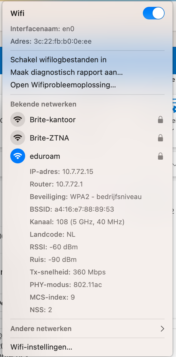 Je Macbook zal nu verbinden met het WiFi-netwerk eduroam: