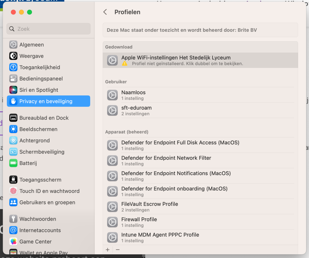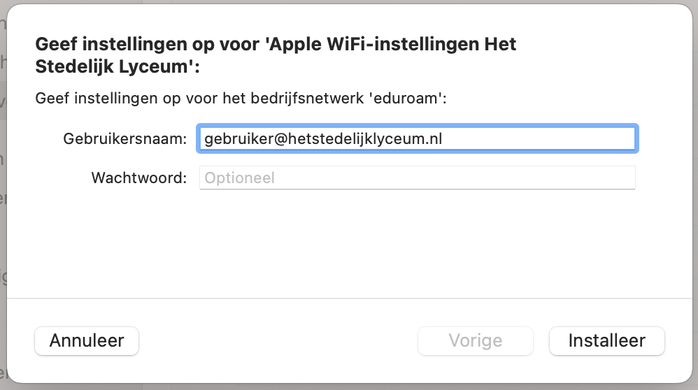 Vul hier je gebruikersnaam en wachtwoord in. Vul bij identiteit je Google e-mailadres en je Google wachtwoord van Het Stedelijk Lyceum in. Klik op Installeer; dit moet je bevestigen met je wachtwoord van je Macbook of je TouchID: