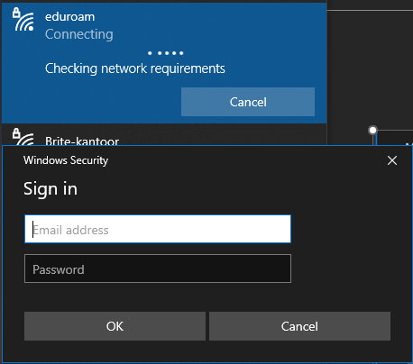 Vul hier je volledige emailadres van het Stedelijk Lyceum in en je wachtwoord en klik op OK. Er wordt nu verbinding gemaakt met Eduroam.